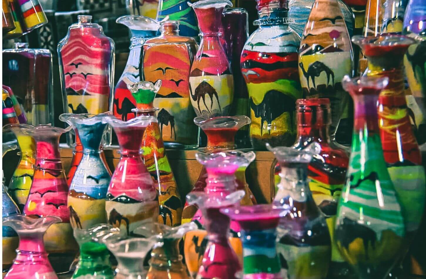 A quirky but beautiful souvenir, sand art bottles are filled with colored sands arranged into desert landscapes, camels, or pyramids. Artists often create them right before your eyes, sealing your name or a short message inside.